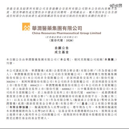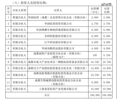 投资界-解码LP消息,7月18日,华润医药发布公告,华润医药(成都)企业管理合伙企业、华润医药投资有限公司、华润博雅生物制药集团股份有限公司、东阿阿胶股份有限公司、华润双鹤药业股份有限公司、江中药业股份有限公司、成都润药产业投资合伙企业,以及五名其他独立第三方拟就成立合资基金,该基金规模为10 亿元人民币,深圳市华润资本股权投资有限公司为该基金管理人。