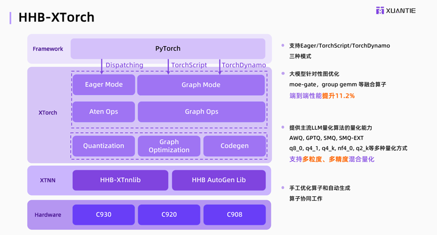 玄铁另一个重要的工作是PyTorch扩展。做好PyTorch的支持,一方面可以使用户能够无痛的切换到RISC-V硬件上,第二个方面可以复用PyTorch目前已经成熟的软件生态、拓展RISC-V的AI能力。具体到玄铁XTorch上,玄铁针对大模型、MoE模型提供系列算子融合,端到端性能提升了11.2%。同时在这个层次也方便用户部署,提供了大模型的良好能力的一些主流良好算法。例如:AWQ、GPTQ等,也提供q80等多粒度、多精度的量化能力支持。具体看一下XTorch如何加速大模型推理的。下图作为典型的一个使用Transformer进行大模型推理的范式。最简单的流程下,我们只需要插入两行代码使能XTorch就可以实现最原生的PyTorch加速。右边是XTorch内部的一些工作,像针对MoE的算子融合,还有其他的一些常规算子融合和模型优化能力。