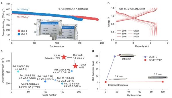 实验数据显示,采用该策略的安时级Li||NCM811软包电池性能卓越:能量密度达547/531Wh/kg,循环155次和189次后容量保持率分别为79%和81%,处于行业领先。