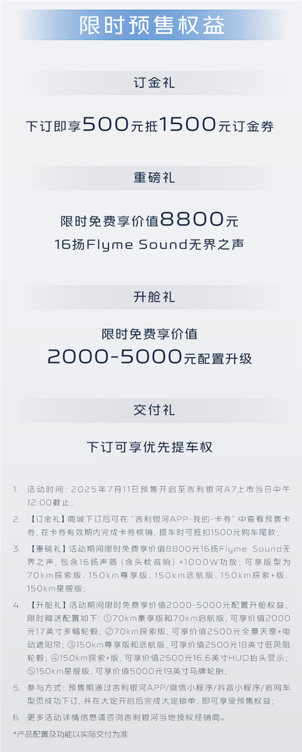 还没完,就在今日,吉利银河官宣给银河A7增加了两款新车型,分别为70km入门版和150km入门版,对应价格为9.78万和11.38万,注意,这是预售,上市价再降2000也是有可能的!