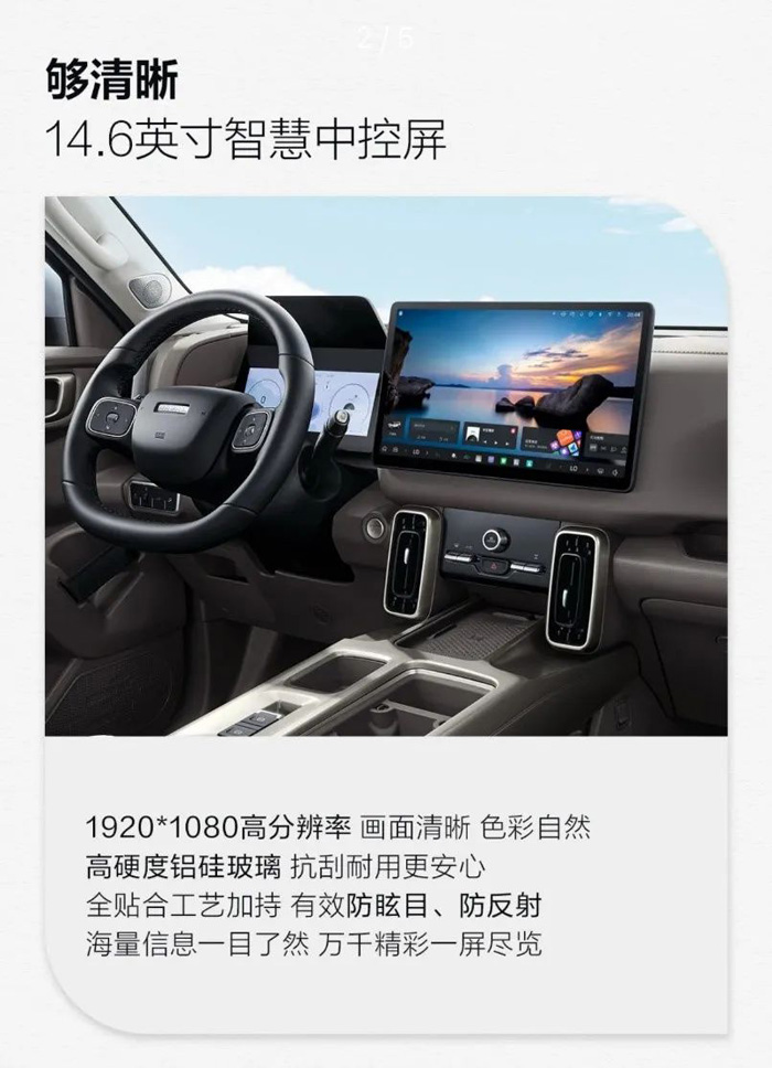 14.6英寸智慧中控屏,悬浮式设计加上窄边框,不仅提升了屏占比,带来更广阔的视觉体验,更将屏幕美学直观地展现在用户眼前,营造出沉浸式科技氛围。同时,该屏幕具备1920*1080高分辨率显示,画面清晰,色彩自然,让海量信息一目了然,万千精彩一屏尽览。另外,屏幕采用了LTPS技术,并集成了TED内嵌式触控。在应用方面,更是搭载了Coffee OS 3智能座舱,带来丝滑流畅的操作体验,交互形式也更加丰富,无论是导航、音乐还是视频,都能在中控屏上轻松实现,让驾驶过程更加愉悦。