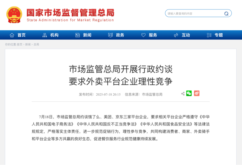 据国家市场监督管理总局网站消息,7月18日,市场监管总局约谈饿了么、美团、京东三家平台企业,要求相关平台企业严格遵守《中华人民共和国电子商务法》《中华人民共和国反不正当竞争法》《中华人民共和国食品安全法》等法律法规规定,严格落实主体责任,进一步规范促销行为,理性参与竞争,共同构建消费者、商家、外卖骑手和平台企业等多方共赢的良好生态,促进餐饮服务行业规范健康持续发展。