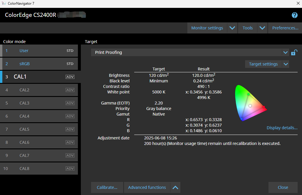 校色完成后,可以看到预设的色彩参数已经写入显示器的Cal1模式,后续可通过软件或显示器的OSD菜单进行切换。