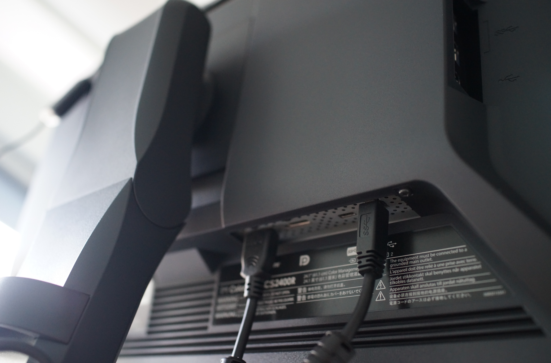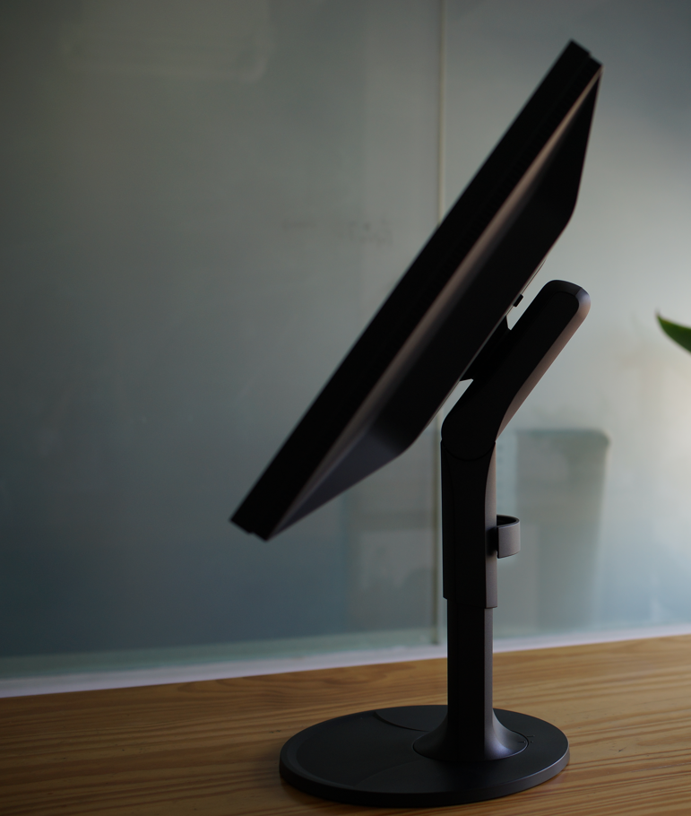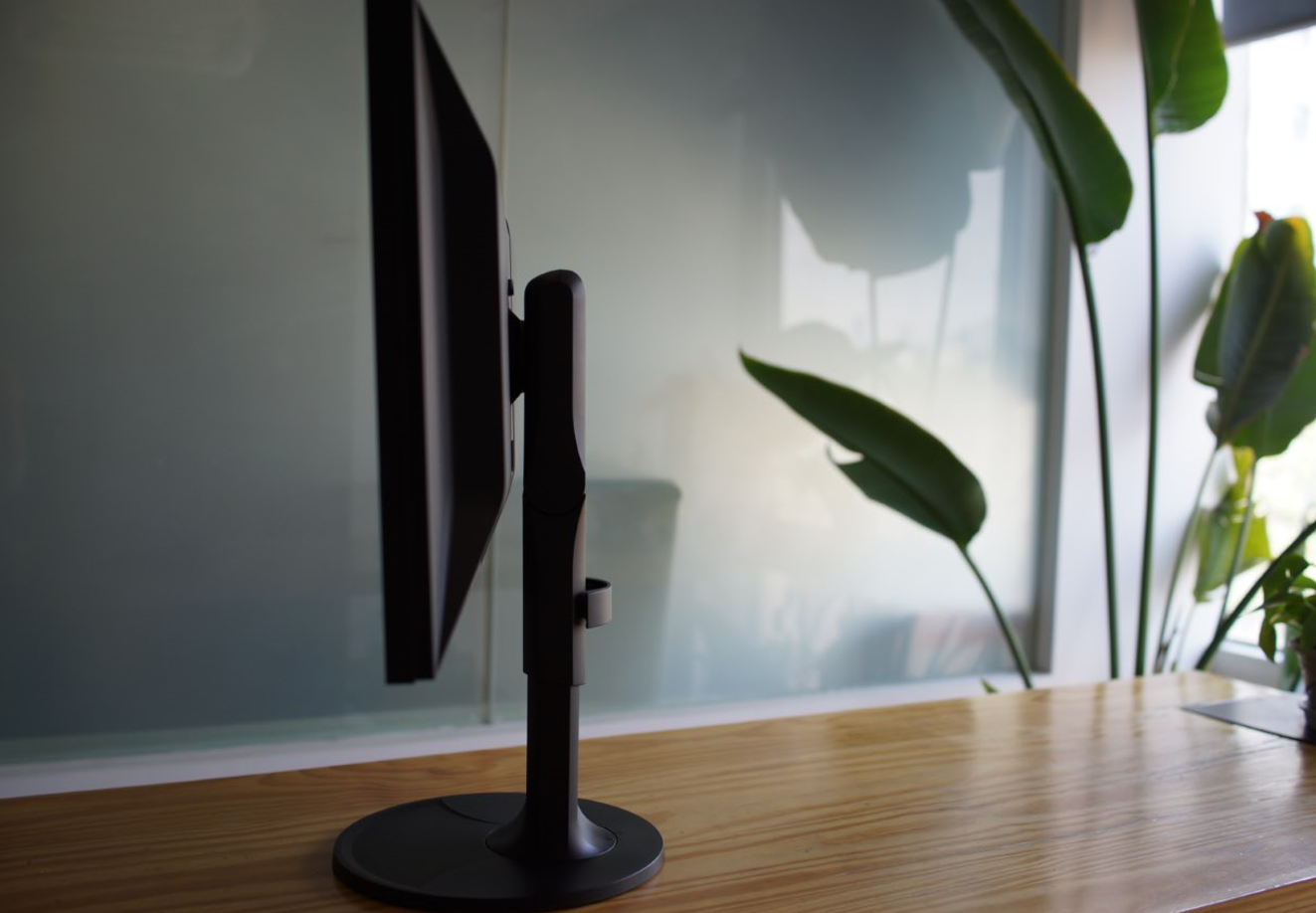 其他品牌的抬头功能都是靠显示器挂架后的轴进行俯仰升降调节,而EIZO的支架把这个“关节”下移到支架上大约1/3处,解决了长期使用转轴容易松动的问题,还能提供更好的稳定性,乃至给用户更大的桌面活动空间。