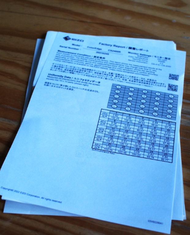 为了确保显示器的色彩品质,在出厂前,每台设备都经过严格的检验,会附带一份出厂报告。可以看到屏幕会被划分为5*5共25个区域,使用工业级色度计设备进行校准不同区域的亮度和色彩。达到误差允许范围才能出厂。