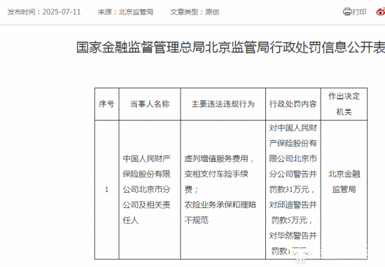 北京监管局发布的行政处罚公开表显示,北京市分公司因为“虚列增值服务费用,变相支付车险手续费”“农险业务承保和理赔不规范两个原因,被警告并罚款31万元。