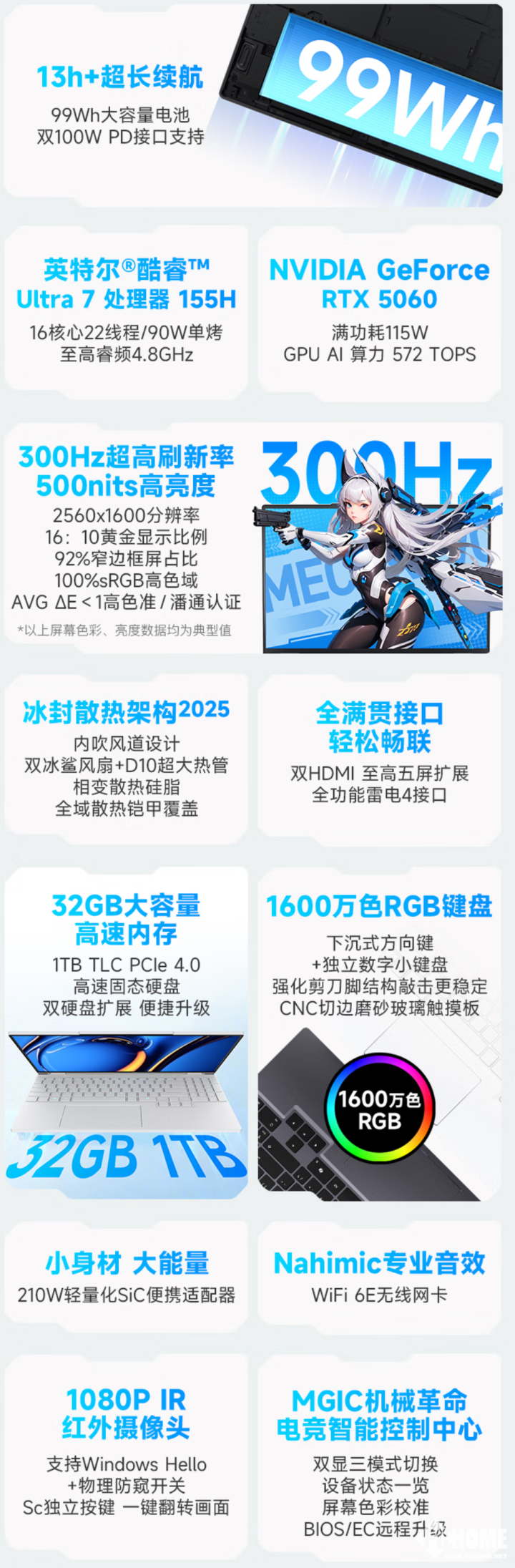 耀世15 Pro 2025搭载了Ultra 7 155H处理器,基于Intel 4工艺制造,具备6个P核、8个E核和2个LP E核,共16核心22线程,其中P核最高睿频4.8GHz。显卡方面配备了RTX 5060移动显卡,配备8GB GDDR7显存,满载功耗可达到115W,整机性能释放为160W。散热方面采用冰封散热架构2025,可以实现持续的高性能输出。笔记本出厂配备了32GB DDR5-5600内存和1TB PCIe 4.0 SSD,预留多1个M.2插槽,方便用户升级扩展容量。