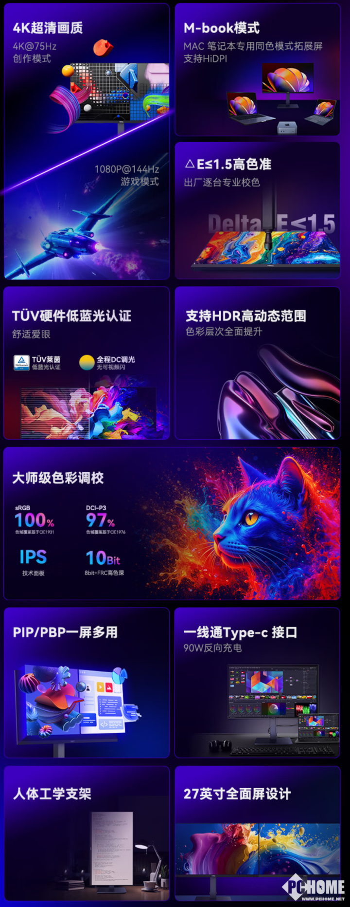 该显示器还支持M-Book原色模式,采用墨蓝精致机身、原木纹理背板和几何线条设计。除此之外,该显示器支持PIP/PBP一屏多用,配备人体工学支架,支持升降/倾斜/旋转,支持VESA 100x100mm壁挂。提供2个HDMI 2.0、1个DP 1.2、1个USB-C 90W、2个USB-A接口(KVM)。