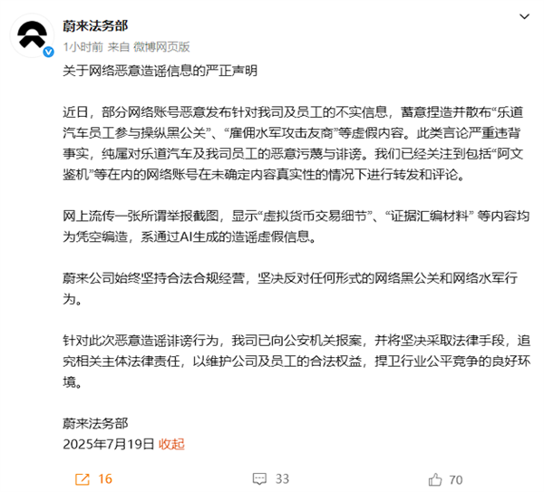 蔚来公司始终坚持合法合规经营,坚决反对任何形式的网络黑公关和网络水军行为。