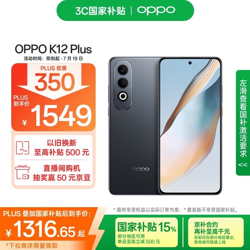OPPO K12Plus 5G手机12GB+512GB玄武黑限时特惠价1233元