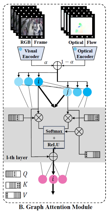 为优化帧级特征并保持时序一致性,EventVAD 设计了基于正交约束的图注意力机制。通过 QR 分解生成正交的查询(Q)、键(K)、值(V)矩阵,避免特征维度坍缩。基于动态图的邻接矩阵计算注意力权重,通过迭代传播更新节点特征,增强事件边界的区分度。