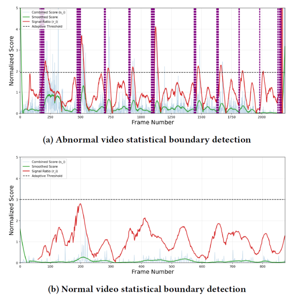 统计边界检测可视化分析如下图,以 UCF-Crime 数据集中的样本为例,对异常视频和正常视频的边界检测过程进行可视化。