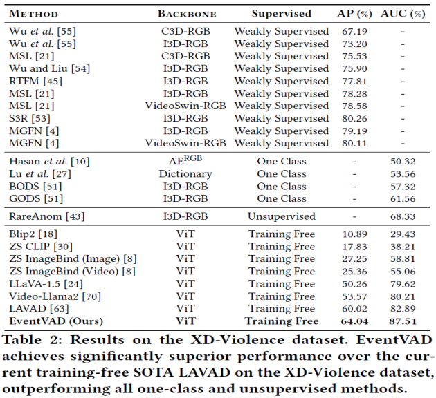 使用 XD-Violence 数据集的结果中,在 AP 和 AUC 指标上均比现有无需训练的 SOTA 方法(LAVAD)高出约 5%,验证了其在高分辨率场景下的适应性。