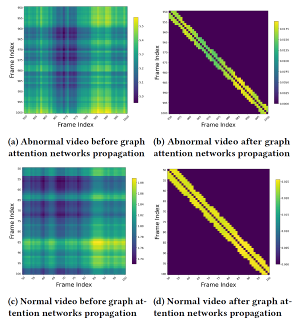 图注意力传播可视化分析如下图,选取 UCF-Crime 数据集中的异常和正常视频样本,对应用图注意力传播前后的帧间关系进行可视化。热力图展示了相应帧区间内帧与帧之间权重关系的变化。