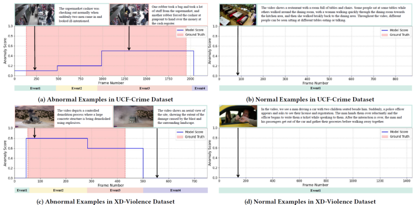 UCF-Crime 和 XD-Violence 数据集中正常样本与异常样本的可视化。对 LAVAD 未能正确检测出异常的样本进行了可视化,下图展示了事件分割结果以及多模态大语言模型(MLLM)的异常帧评分,并与真实标签进行了对比。