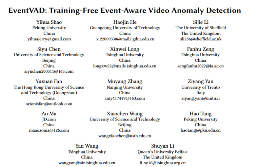 来自北京大学,清华大学的研究团队联手京东(JD.com)在 ACM MM 2025 发表了一种以事件为中心低成本高效的 Training-Free 视频异常检测框架 EventVAD,论文第一作者邵轶骅目前为北京大学学术访问学生,项目负责人为来自京东(JD.com)的算法研究员马傲,目前代码和数据已全面开源。