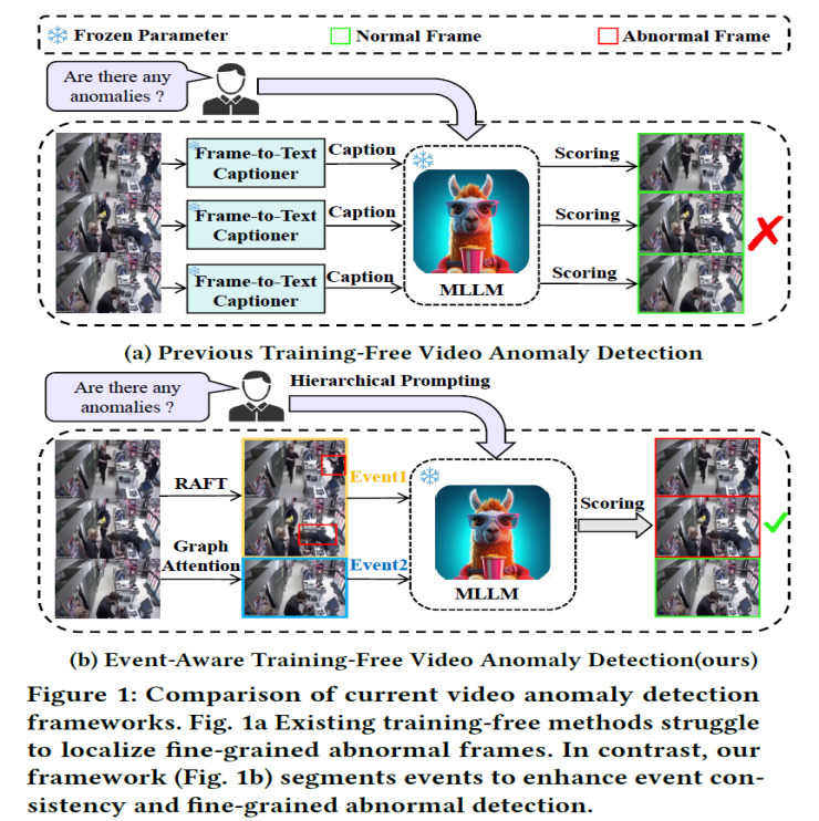 有监督方法依赖大量标注数据,在新场景中需重新微调,泛化能力差;即使是单类监督或无监督方法,也因缺乏有效标签难以达到理想性能。无需训练方法以 LAVAD 为代表的方法通过视觉问答模型和 LLMs 评分实现异常定位,但存在两大问题:一是依赖至少 130 亿参数的 LLM,导致框架效率低下;二是缺乏对视频的时序理解能力,难以连贯解析长视频,易出现误检和长尾问题。