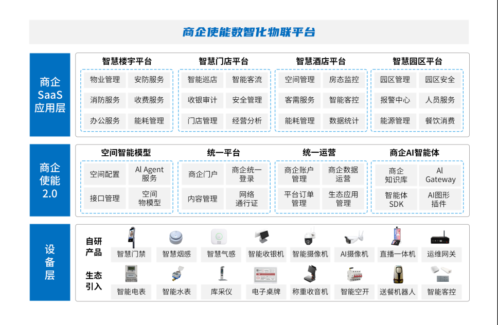 • 商企场景化应用:持续丰富楼宇、门店、酒店场景应用,新增智慧会议室管理、门店APP、智能配送等,并接入20+生态产品及5+生态应用,物模型新增20+。