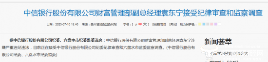 7 月 10 日,一则重磅消息震动金融圈。贵州省纪委监委发布通报,中信银行股份有限公司(简称中信银行)财富管理部副总经理袁东宁,目前正在接受中信银行审查和六盘水市调查组调查。