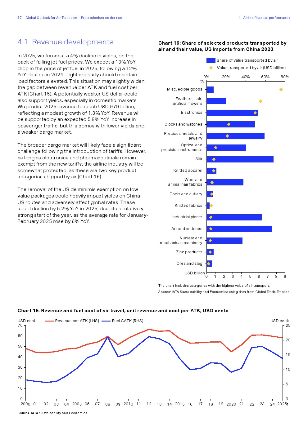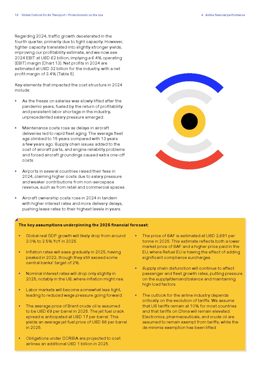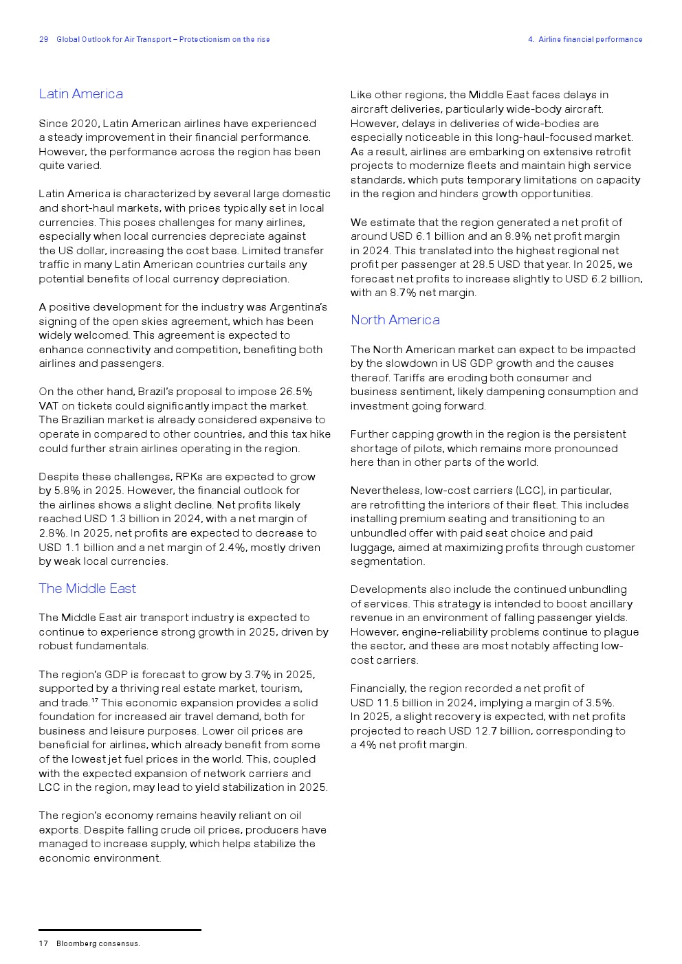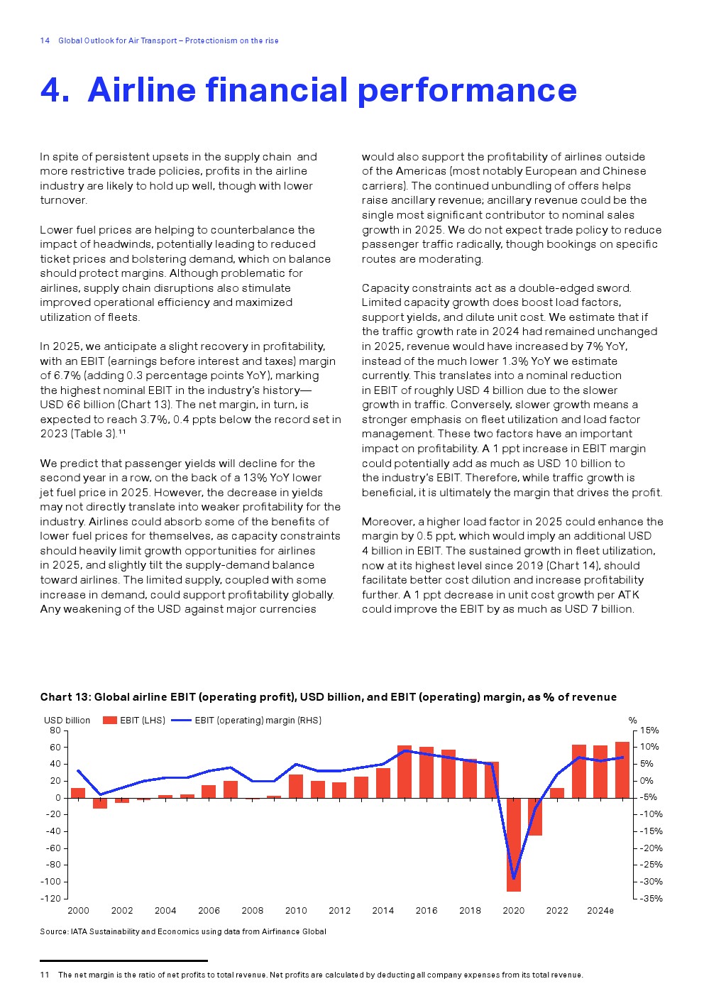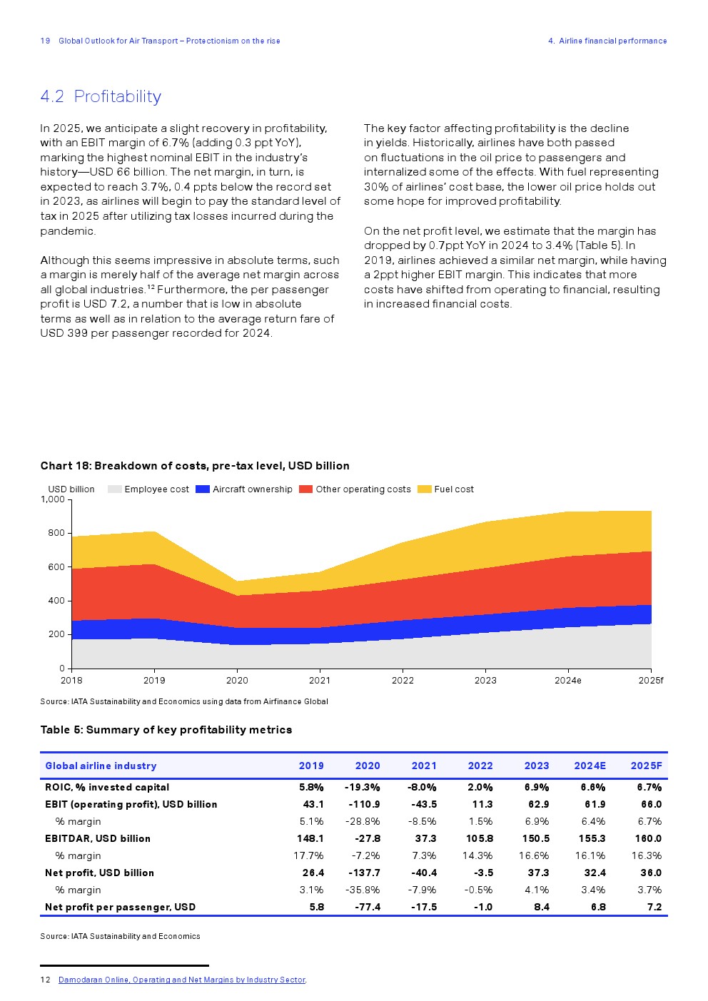 我们预计2025年航空公司收入将与2024年基本持平。预测净利润为360亿美元,净利润率仍维持在3.7%的低位。尽管这一表现在航空业历史上已属最佳之列,但其净利润率仍仅为全球各行业平均水平的一半。