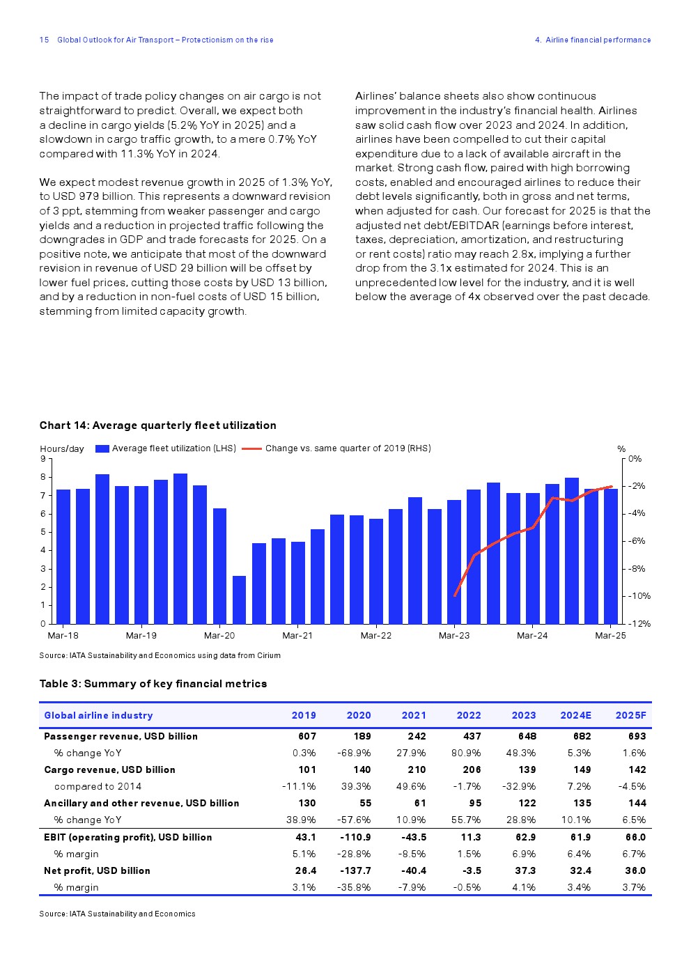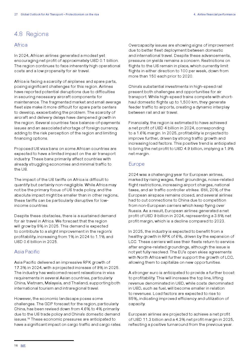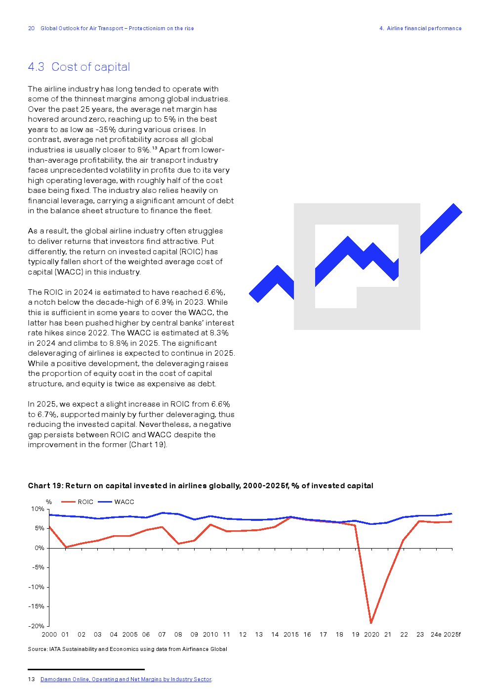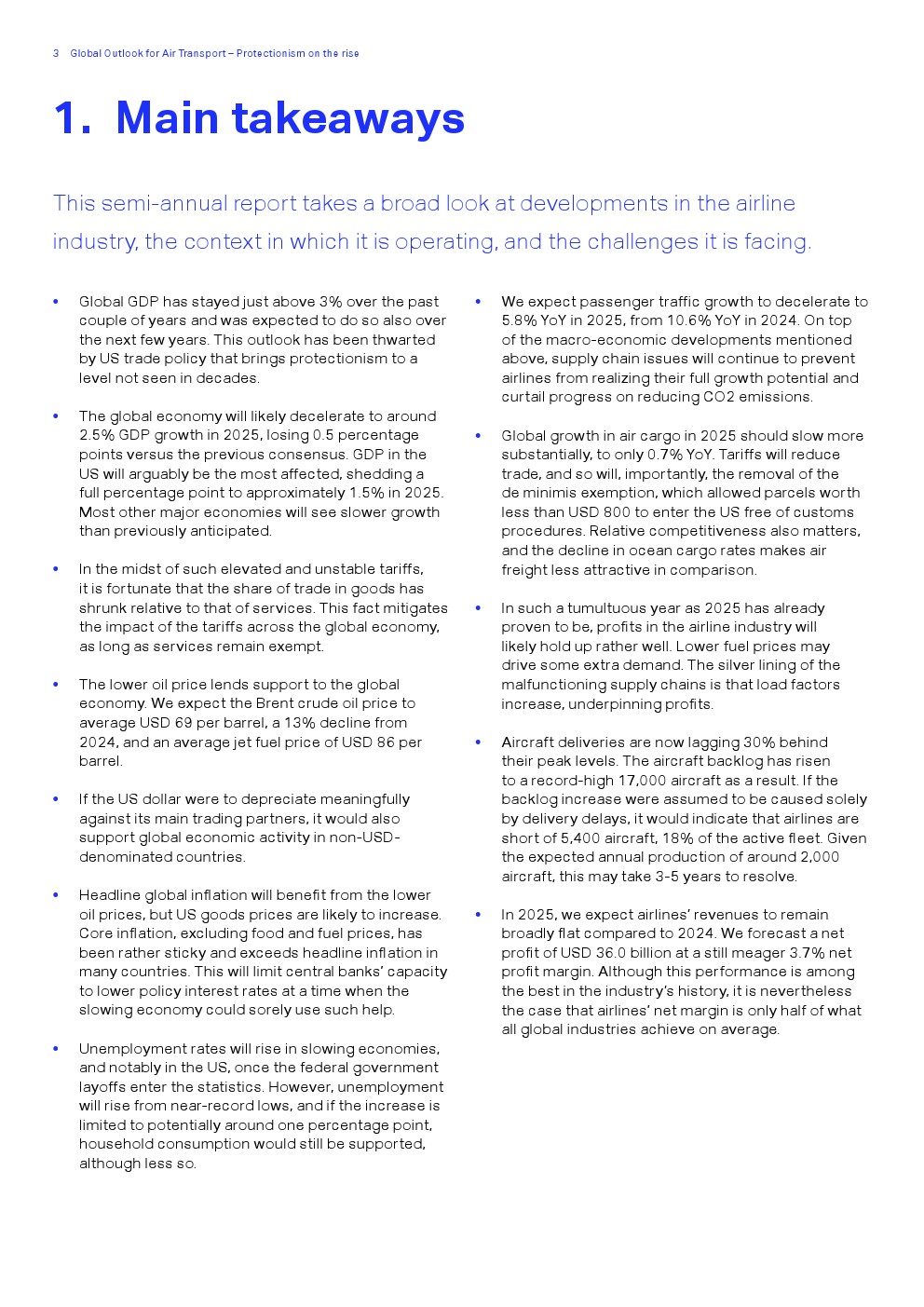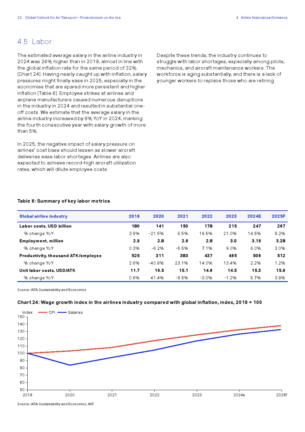 我们预计2025年航空公司收入将与2024年基本持平。预测净利润为360亿美元,净利润率仍维持在3.7%的低位。尽管这一表现在航空业历史上已属最佳之列,但其净利润率仍仅为全球各行业平均水平的一半。