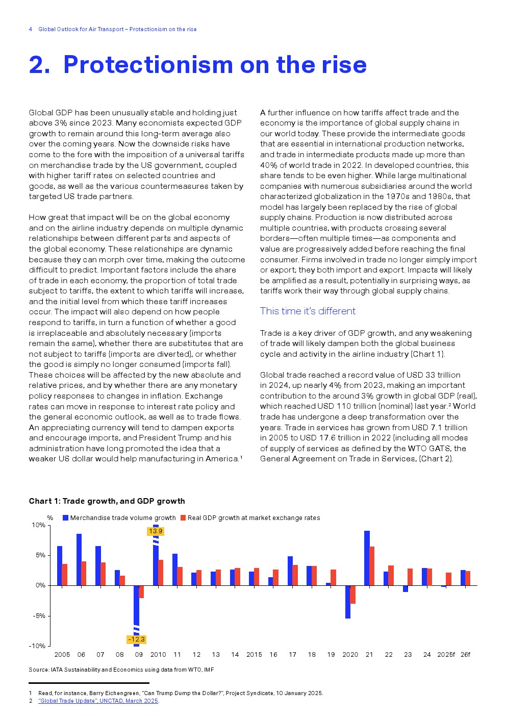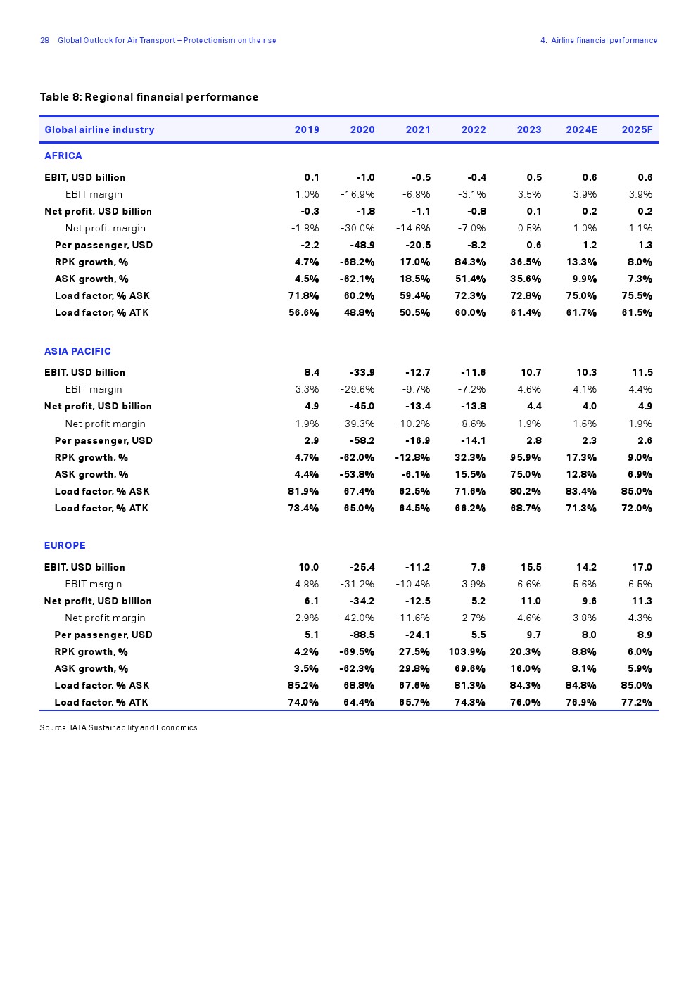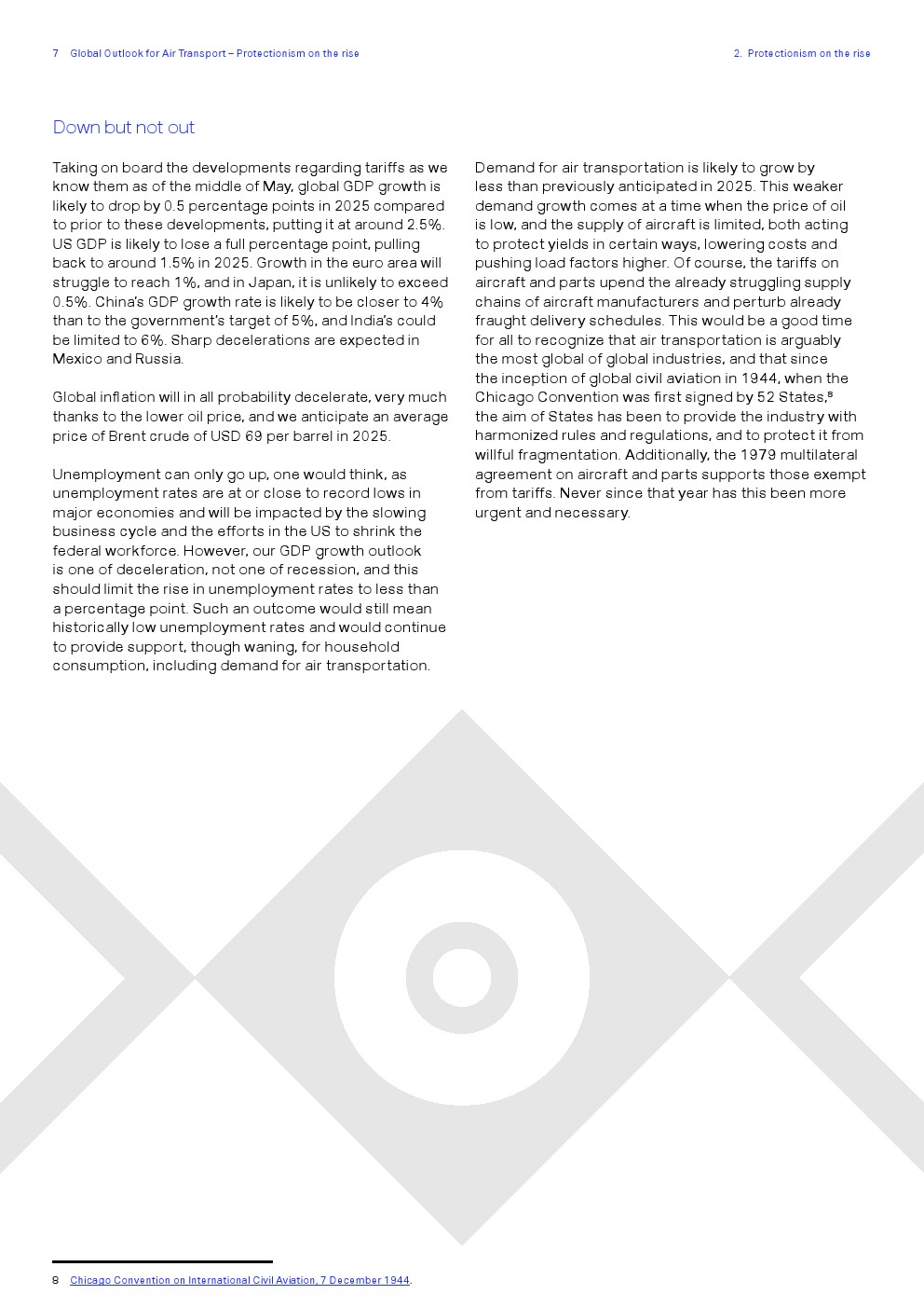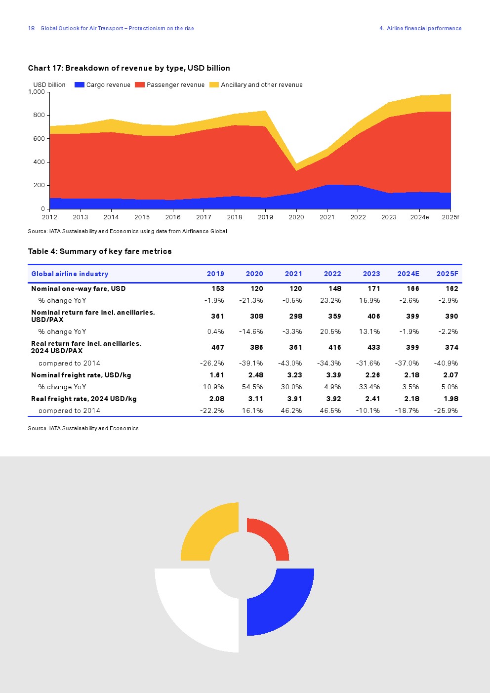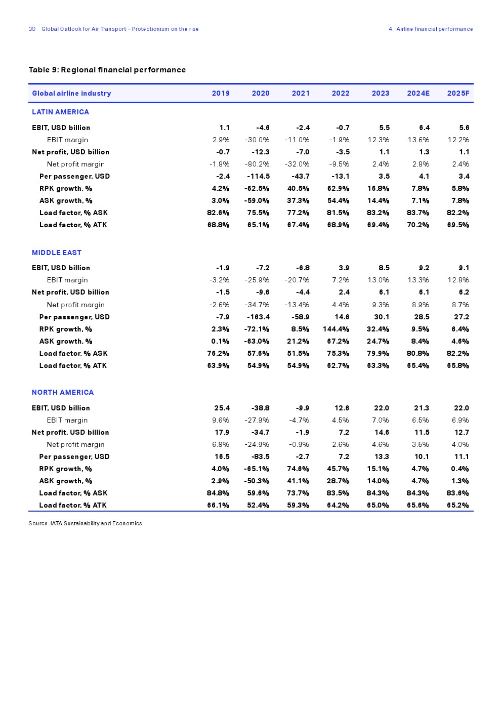 我们预计2025年航空公司收入将与2024年基本持平。预测净利润为360亿美元,净利润率仍维持在3.7%的低位。尽管这一表现在航空业历史上已属最佳之列,但其净利润率仍仅为全球各行业平均水平的一半。