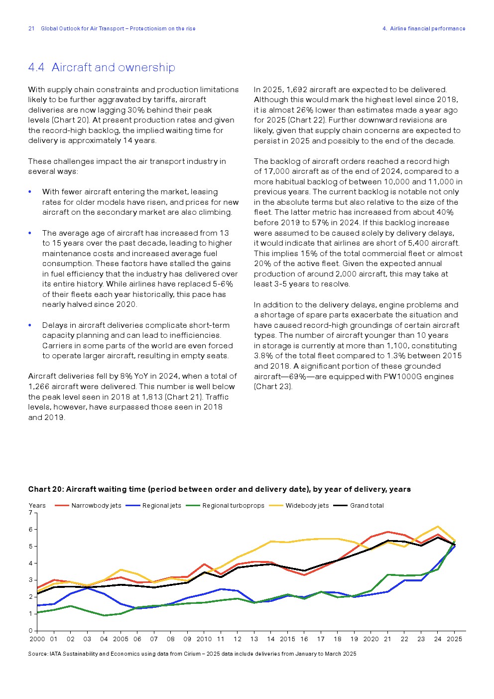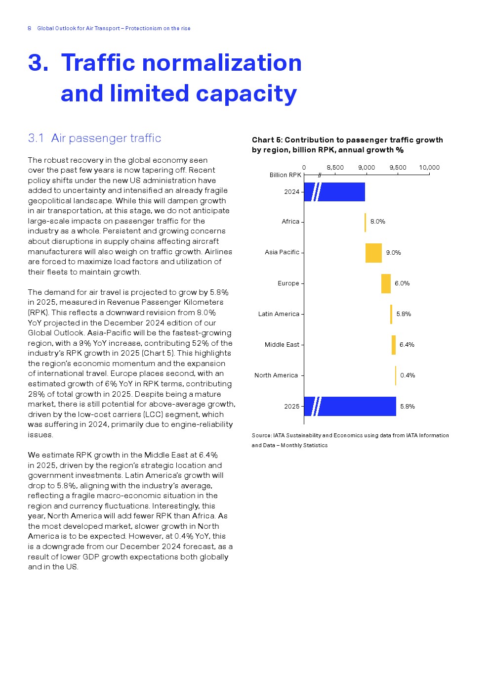 我们预计2025年客运量增速将从2024年的10.6%放缓至5.8%。除上述宏观经济因素外,供应链问题将继续阻碍航空公司实现全部增长潜力,并延缓减排进程。