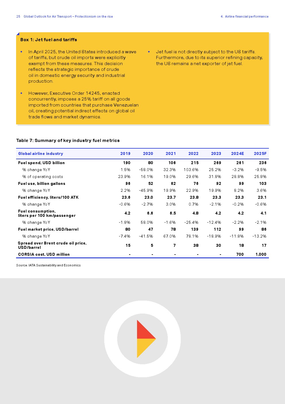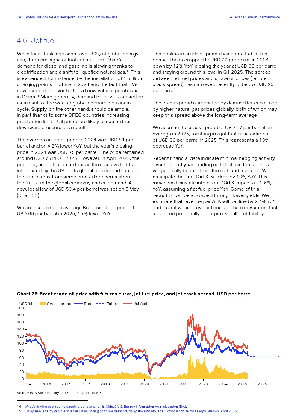 油价下跌为全球经济提供支撑。我们预计布伦特原油均价将为每桶69美元,较2024年下降13%,航空燃油均价预计为每桶86美元。