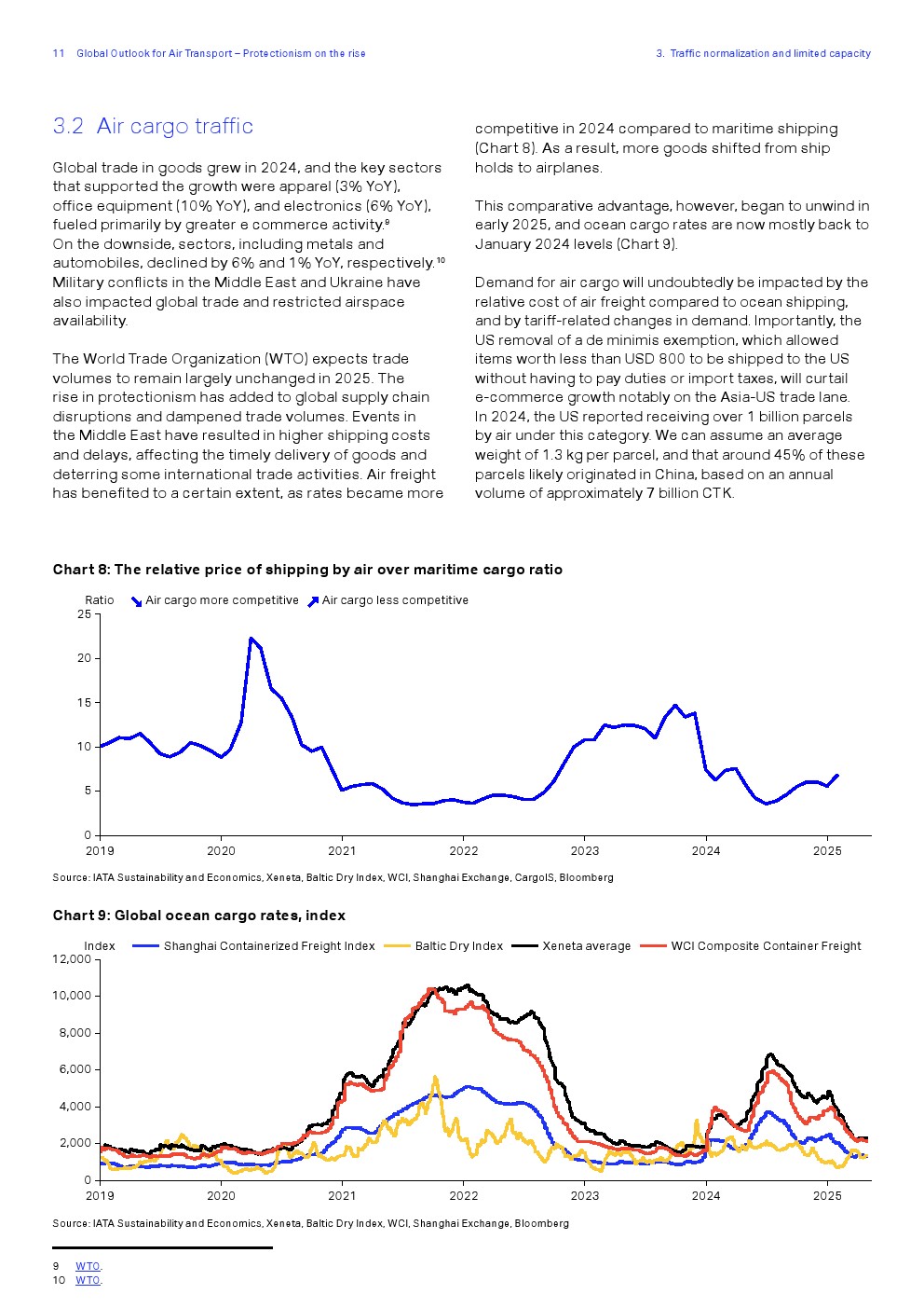 2025年全球航空货运增速将显著放缓至0.7%。关税将抑制贸易,更重要的是取消800美元以下包裹免关税政策的”最低限度”豁免条款也将产生影响。相对竞争力同样关键,海运费用下降使得空运相形见绌。