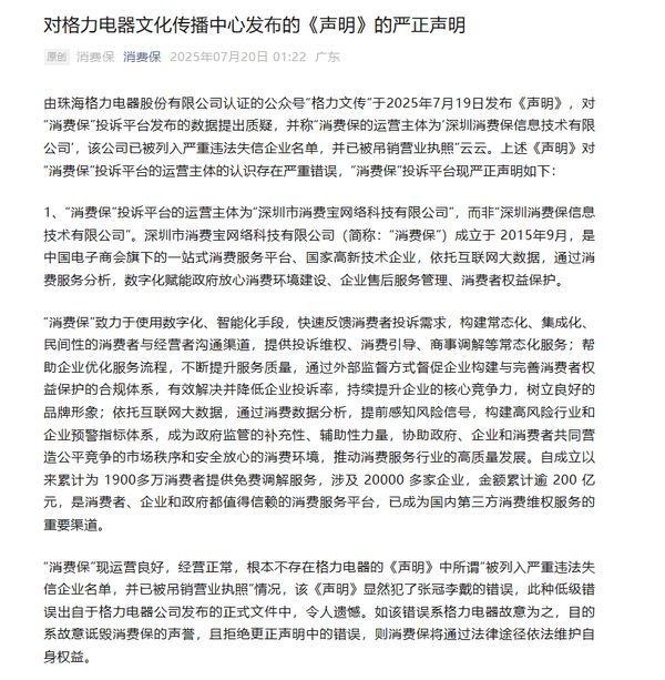 格力的声明迅速引发了广泛关注,随后,“消费保”于7月20日凌晨发表长文回应,称其目前运营状况良好,不存在格力所提及的被列入严重违法失信企业名单或已被吊销营业执照的情况。