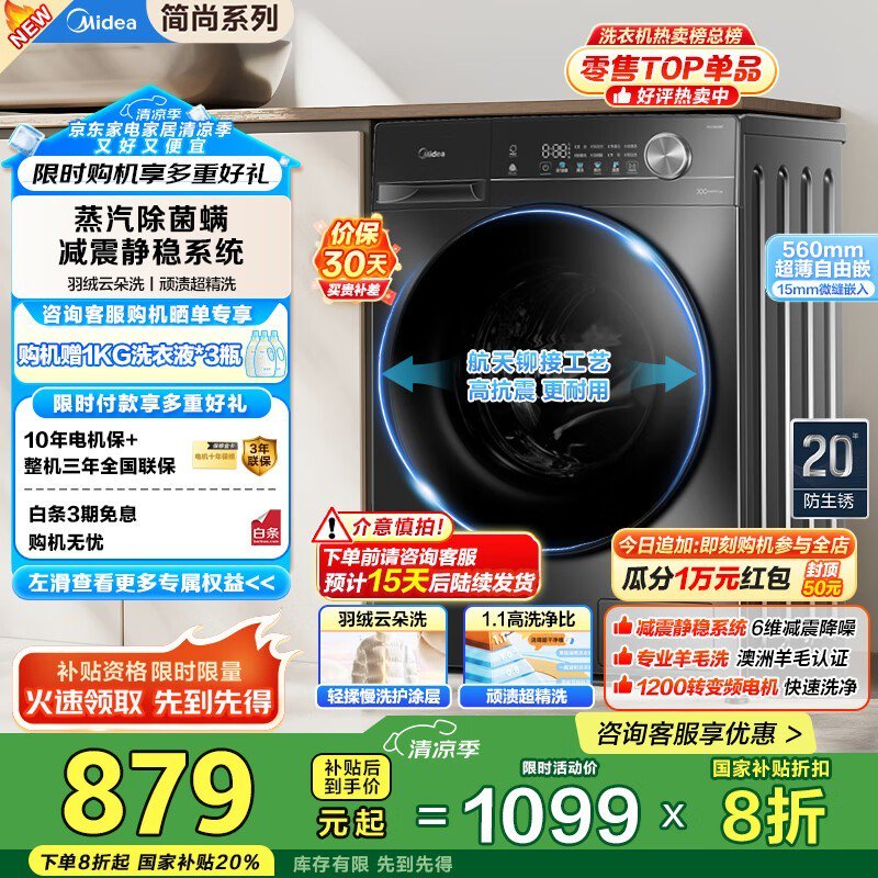 美的MG100V36T滚筒洗衣机京东优惠价863元