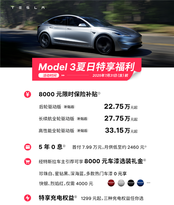 此外,特斯拉还公布了Model 3夏季特享福利,即日起至7月31日,购买特斯拉Model 3可享受8000元限时保险补贴。