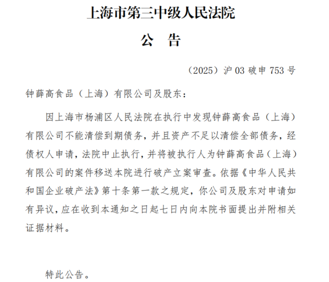 7月16日,上海市第三中级人民法院发布一则破产审查公告,钟薛高食品(上海)有限公司因“不能清偿到期债务且资产不足以清偿全部债务”,被债权人上海臻料贸易有限公司申请破产审查。消息一出,话题#雪糕刺客真的凉凉了#迅速登上微博热搜。