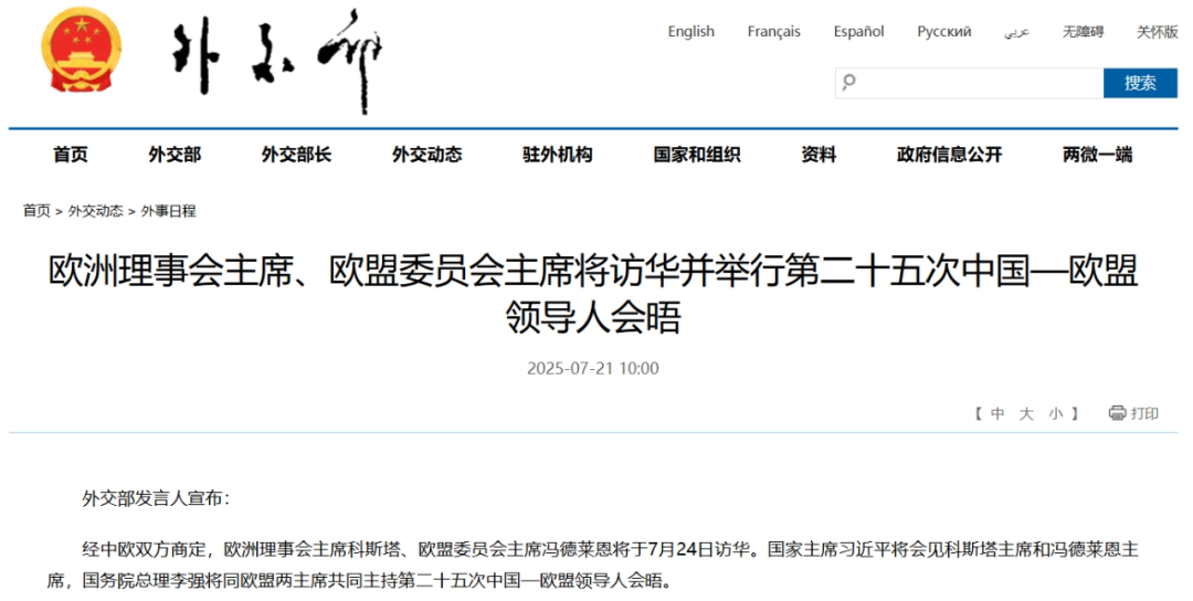 经中欧双方商定,欧洲理事会主席科斯塔、欧盟委员会主席冯德莱恩将于7月24日访华。国家主席习近平将会见科斯塔主席和冯德莱恩主席,国务院总理李强将同欧盟两主席共同主持第二十五次中国—欧盟领导人会晤。