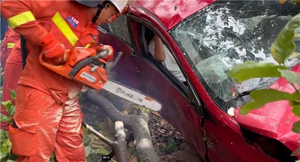 消防员赶到后,先用电锯将挡住车门的树木锯断并搬离,随后使用液压扩张器对车门进行破拆,将车内男子被成功解救出来,转移到救护车上,并无大碍。