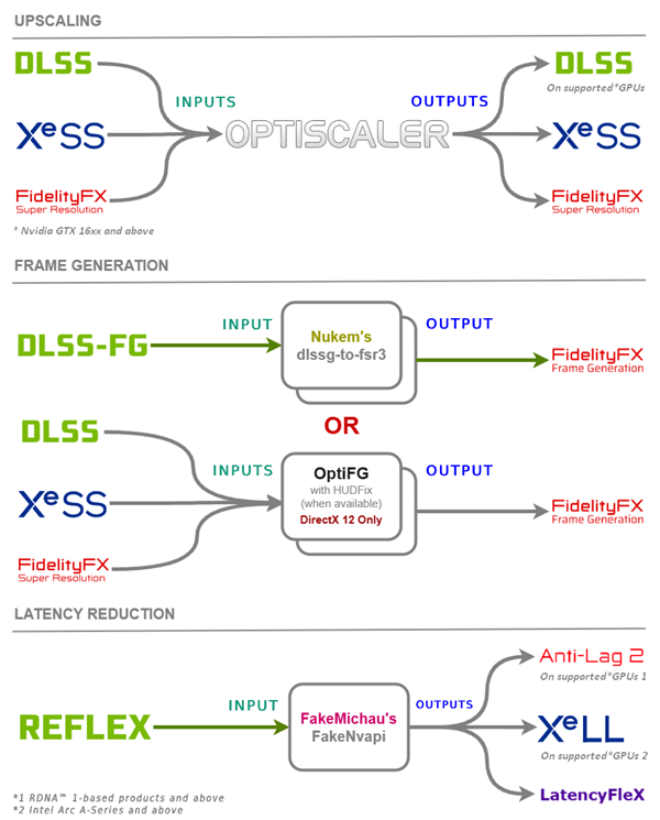 比如游戏支持FSR 2且未更新到更高版本,OptiScaler可以将FSR 2输入转换为DLSS、XeSS,或者将其上采样到更新的FSR版本。