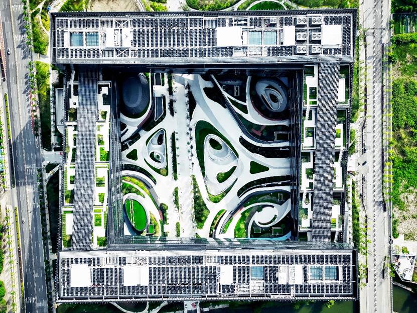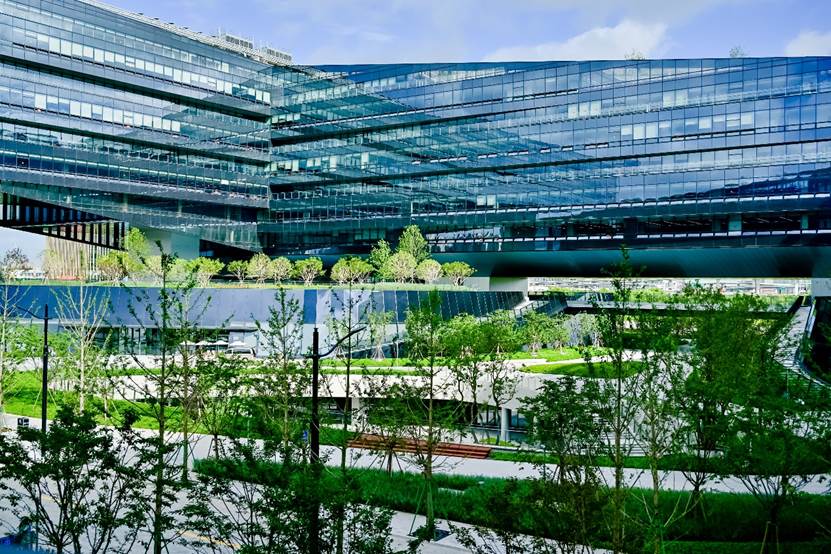 上海美的全球创新园区坐落于上海青浦区西虹桥商务区核心地带,紧邻国家会展中心,项目总投资逾70亿元、总建筑面积达40万平方米。从高空俯瞰,园区建筑呈一个“回”字,以颠覆传统的姿态重塑了建筑与自然的关系,采用起伏、架空、屋顶等多种方式,扩大绿化空间,形成立体丰富的绿地森林系统。