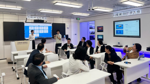 考察团实地参观itc智慧展厅,详细了解itc保伦股份在教育领域的实践成果、亮眼成就与创新探索。展厅内,校园驾驶舱(数据可视化管理系统)、智慧会议室、声光影体验厅及智慧教室体验区吸引了考察团重点关注。