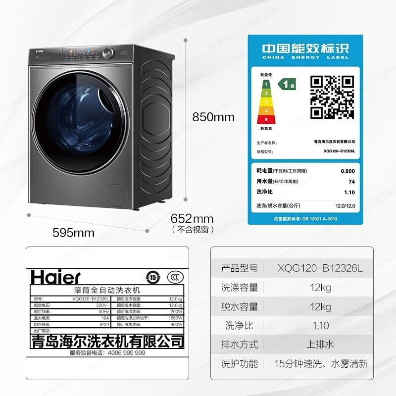 海尔12Kg滚筒洗衣机京东活动价2158元