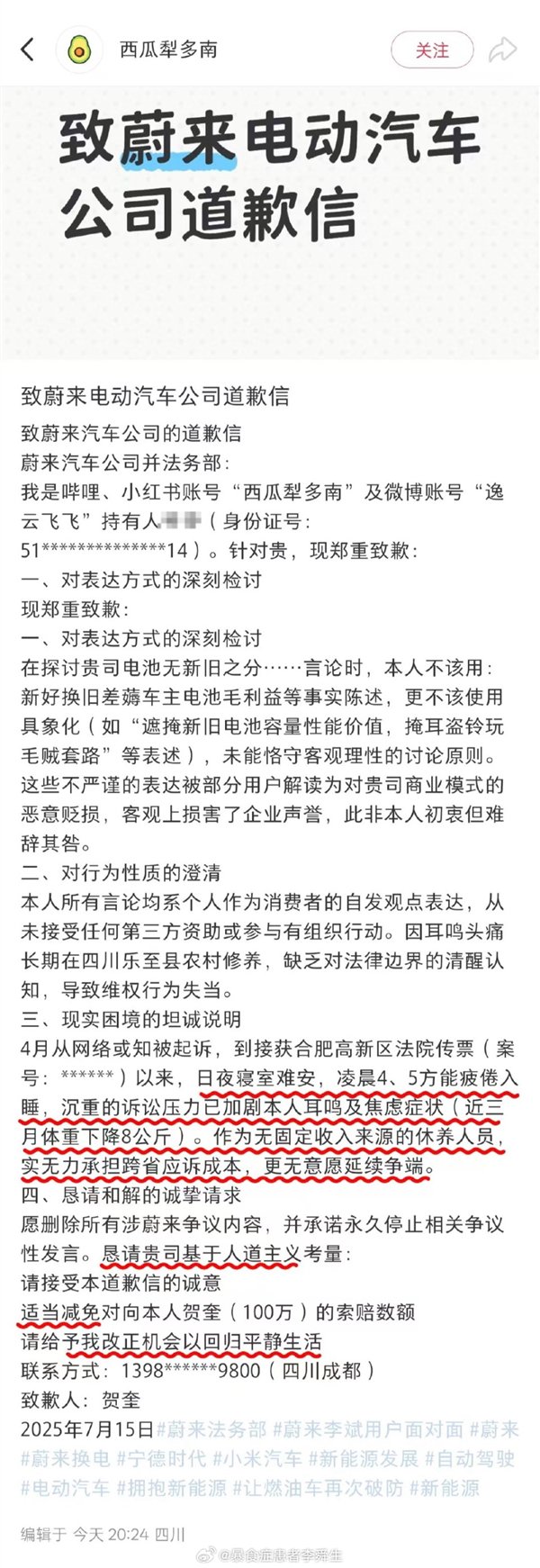 愿删除所有涉蔚来争议内容,并承诺永久停止相关争议性发言,恳请贵司基于人道主义考量: