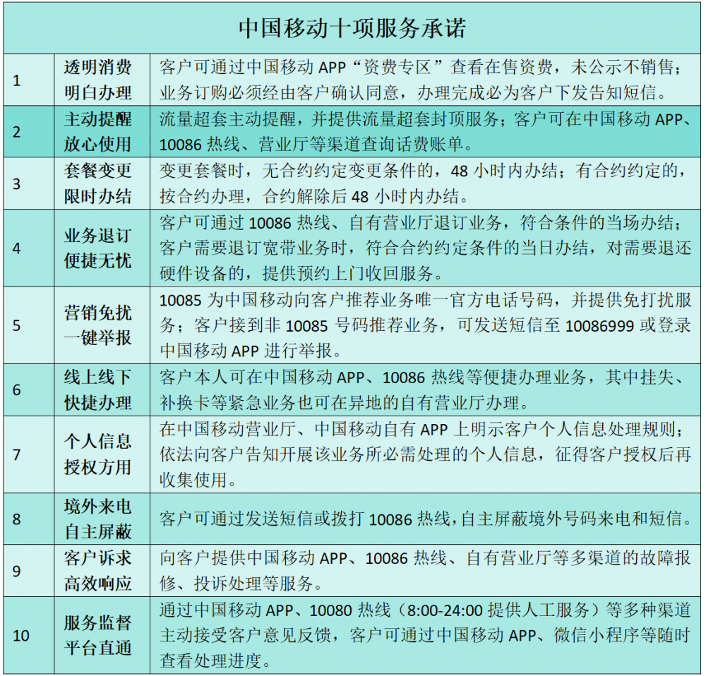 中国移动推出“一套”十项服务承诺,切实保障客户的知情权、选择权、隐私权和投诉权。