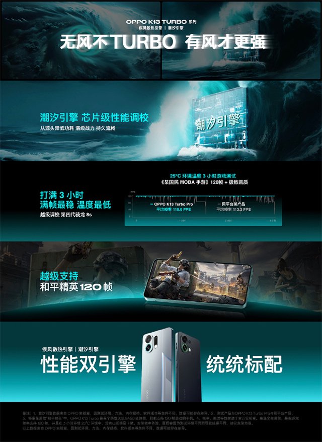 在性能上,OPPO K13 Turbo Pro搭载潮汐引擎 x 第四代骁龙8s处理器,自研芯片级解决方案与次旗舰芯片强强联合,在2K价位段打造越级性能体验。