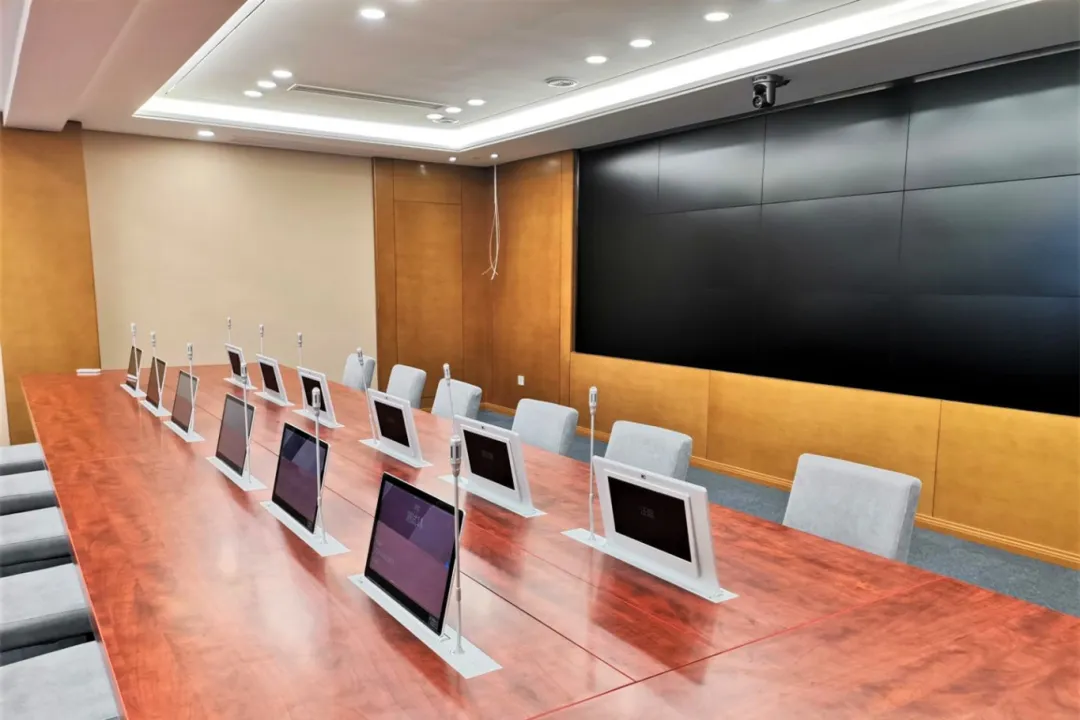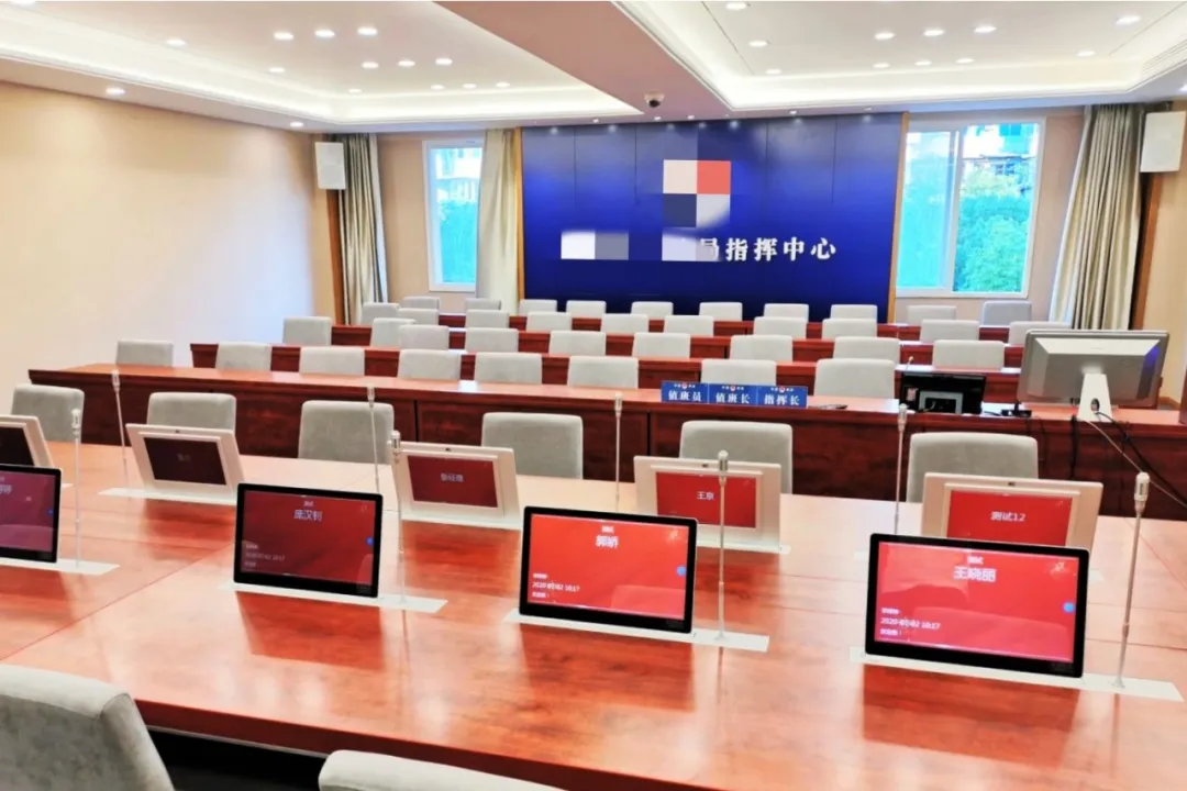 为满足司法行政会商需求,itc在重庆某司法指挥中心会商区配置了 自研的无纸化会议系统,高度集合升降式数字会议话筒、无纸化终端主机、高清网络编码模块、智能中控等多种媒体设备 ,可实现无纸化升降器、数字会议单元的统一升降管理,并且能够在短时间内完成会议信息上传、会议议程、会议资料、会议签到、投票表决、会议讨论、电子白板、文件共享、同屏广播、会议纪要等多种会议功能,覆盖会前、会中、会后全流程,有助于简化司法指挥中心会议流程,提高司法决策会议效率。