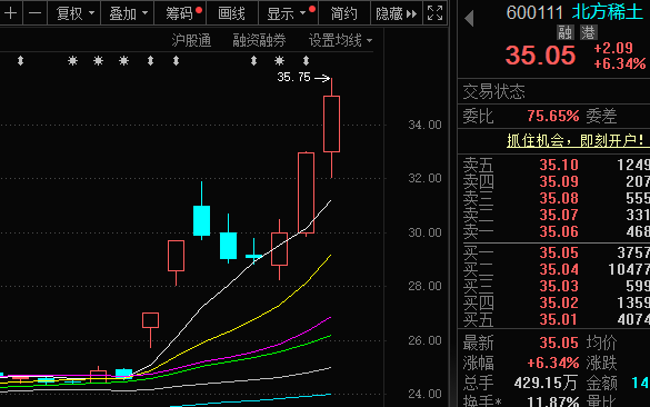 从盘面表现看,近期北方稀土的股价表现强势。截至7月21日收盘,北方稀土涨6.34%,报35.05元/股,当日成交金额146.64亿元。自7月10日至今,北方稀土累计上涨42.77%。