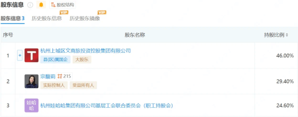 娃哈哈集团有三大股东,分别是杭州上城区文商旅投资控股集团有限公司、宗馥莉(继承自宗庆后)、杭州娃哈哈集团有限公司基层工会联合委员会(职工持股会),持股比例分别为46%、29.4%、24.6%。