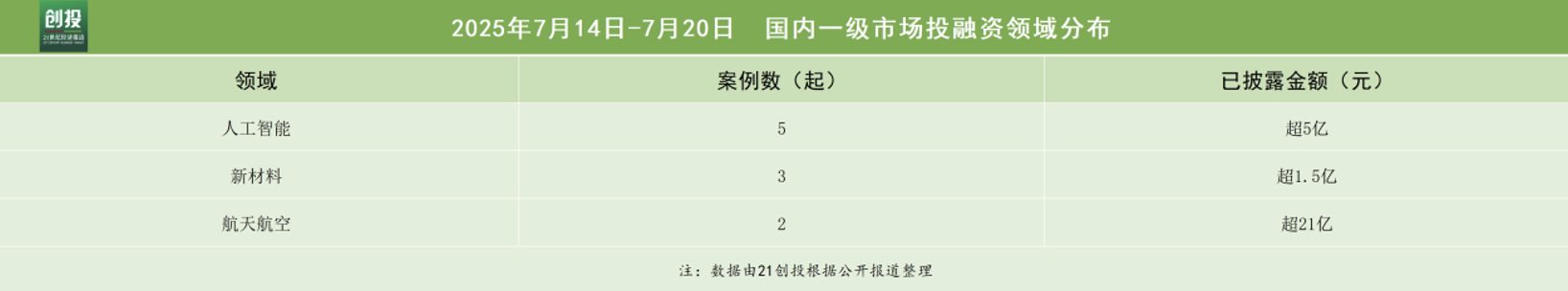 从投融资交易数量角度,21创投不完全统计,7月14日—7月20日,报告日期内国内一级市场发生融资事件27起。其中,有26笔融资披露了融资金额和币种信息,总规模约合人民币46.96亿元。