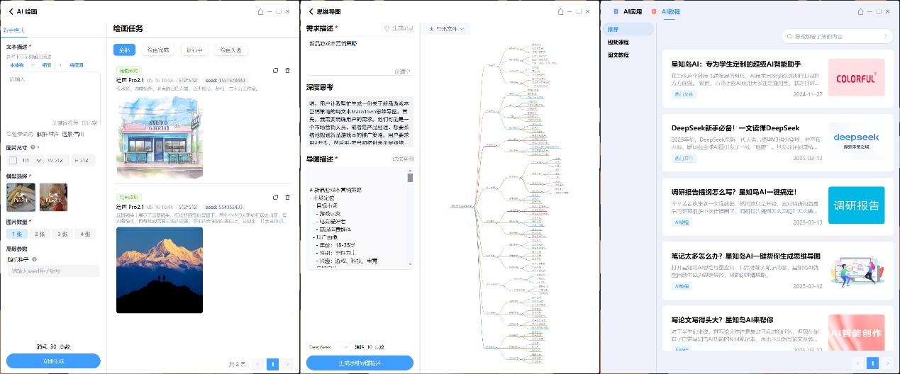 AI绘画功能也非常好用,它大幅简化了文生图的操作门槛,新手也能快速掌握。思维导图也是如此,操作门槛低,生成的效果可用性强。此外针对没有AI软件使用经验的用户,星知岛也提供了大量的教程。简单的操作、实用的功能,对于诸如学生这类用户群体来说,可以辅助完成课业、发展兴趣。