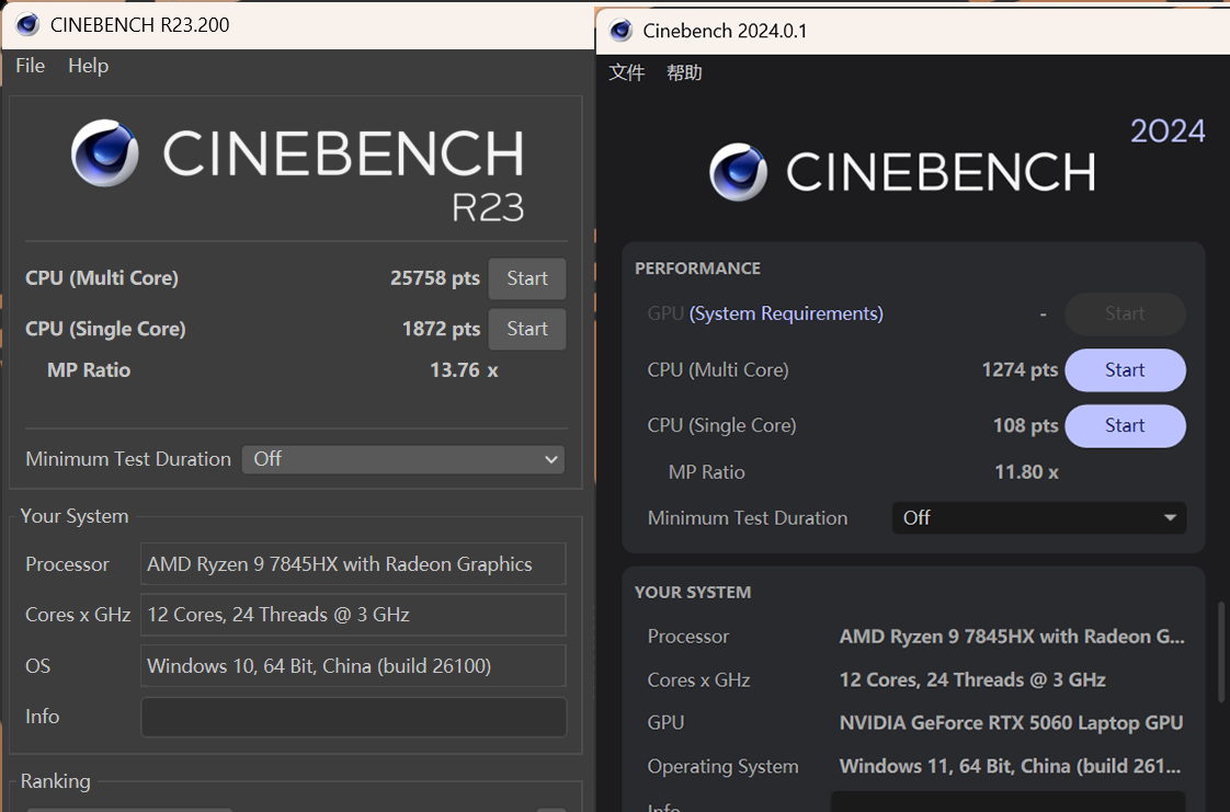 使用Cinebench进行测试,实测Cinebench R23多核成绩为25758pts、单核成绩为1872pts;Cinebench 2024多核成绩为1274pts、单核成绩为108pts。性能表现属于目前移动平台的中高端型号,在同价位机型中表现优异。