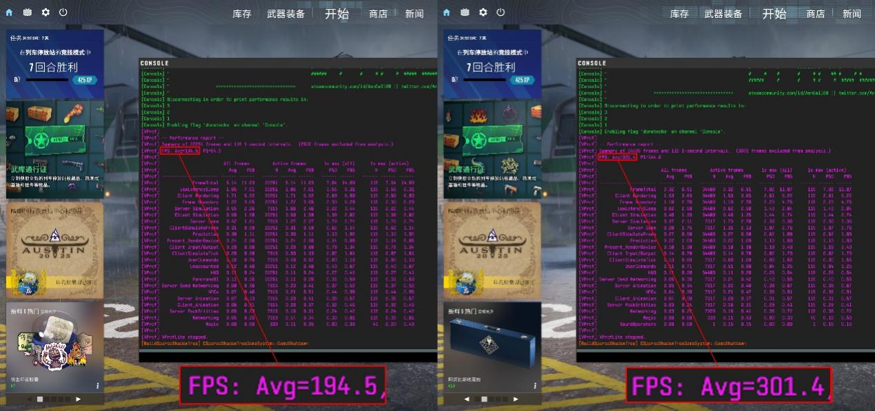 《CS2》测试了两个画质模式,使用的是创意工坊中第三方benchmark。在高画质下,游戏的平均帧数为194.5帧,流畅度不错;切换至中画质,游戏的帧数会暴涨到301.4帧,如此高的帧数,满足专业玩家也足够了。