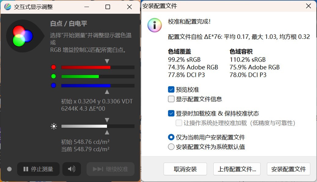 我们对屏幕的亮度、色域和色准进行测试。实测得到最高亮度为548尼特,超过官方宣称值;色域覆盖99.2% sRGB、74.3% Adobe RGB、77.8% DCI P3,色域容积110.2% sRGB、75.9% Adobe RGB、78% DCI P3,确实是一块高色域屏幕。